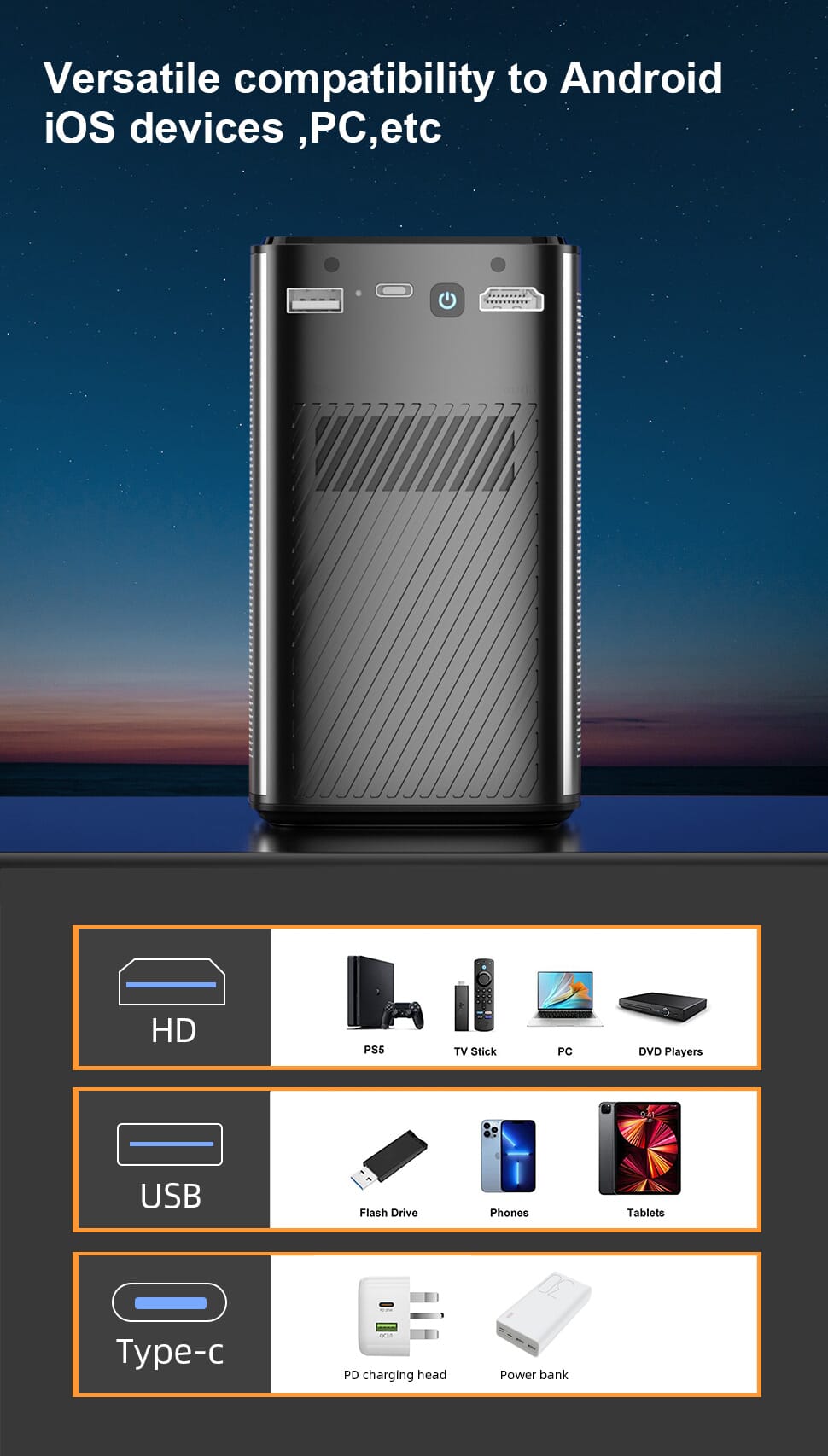 Byintek P70 gör det enkelt för alla att njuta av en förstklassig bildupplevelse. Med automatisk TOF-laserfokusering justerar den sig själv för optimal skärpa. Dess inbyggda batteri på 8000mAh ger dig friheten att ta med dig projektorn utan att vara beroende av en strömkälla.